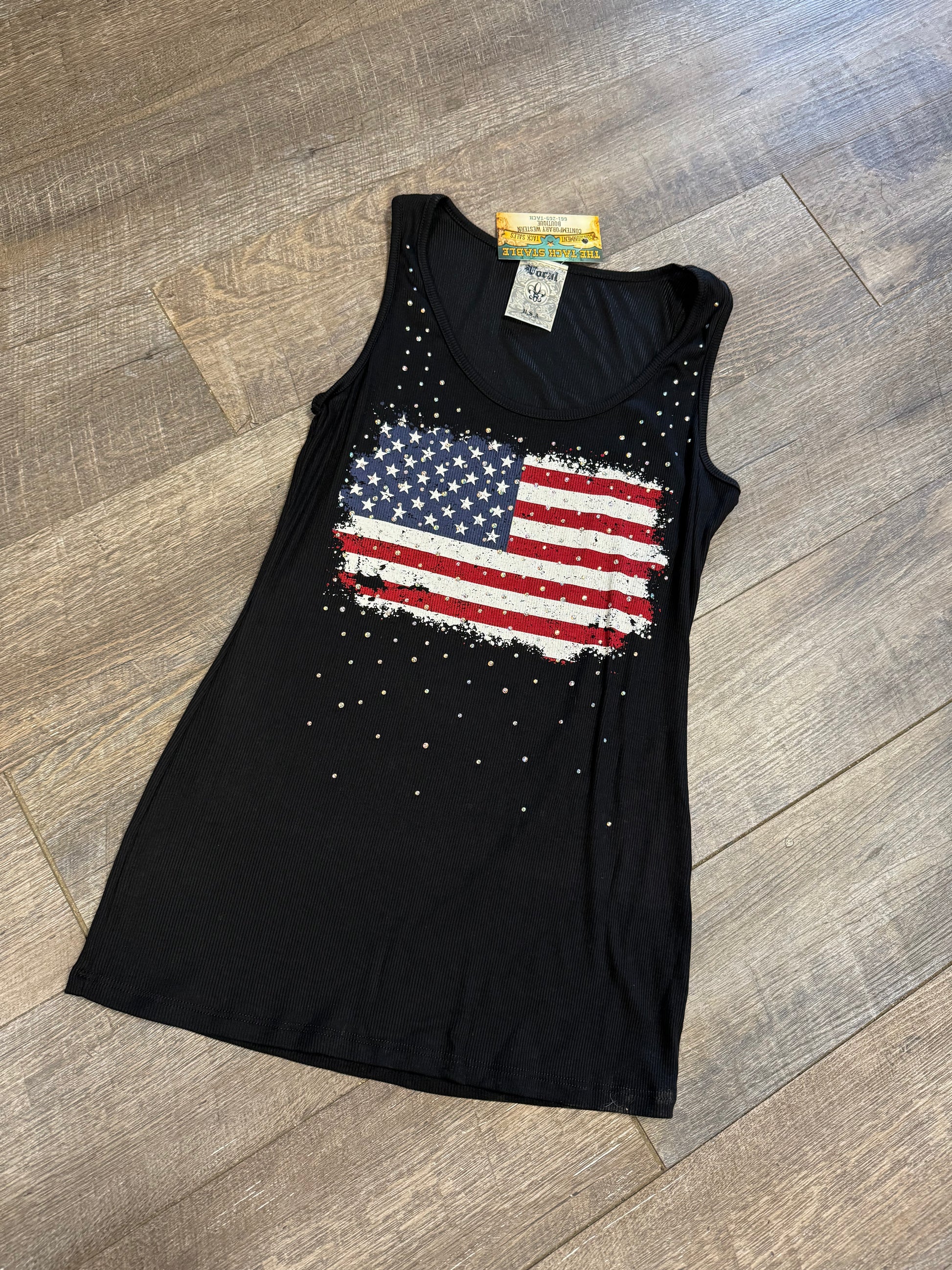 Show your pride in our great country with awesome ribbed tank emblazoned with Old Glory and rhinestones!!